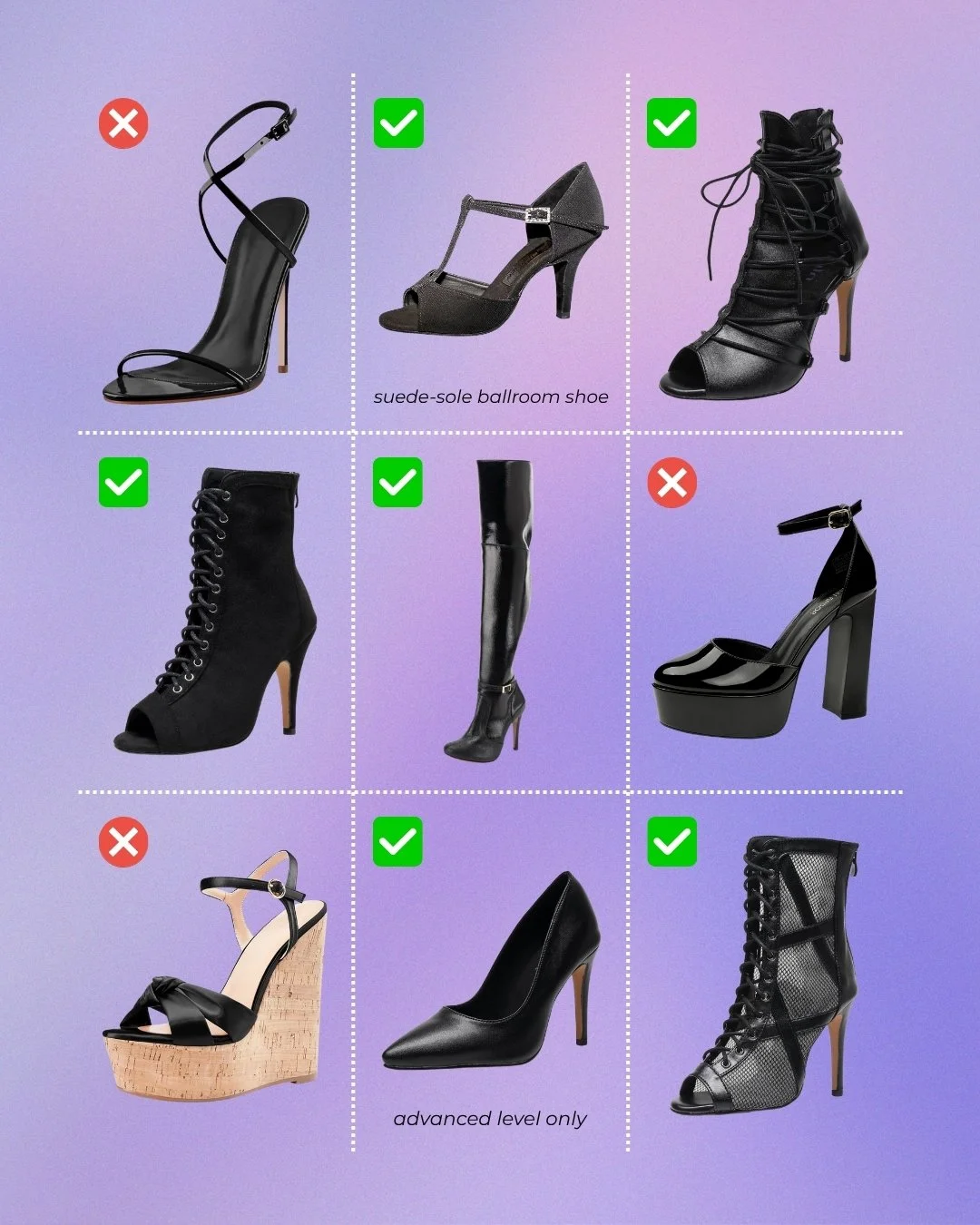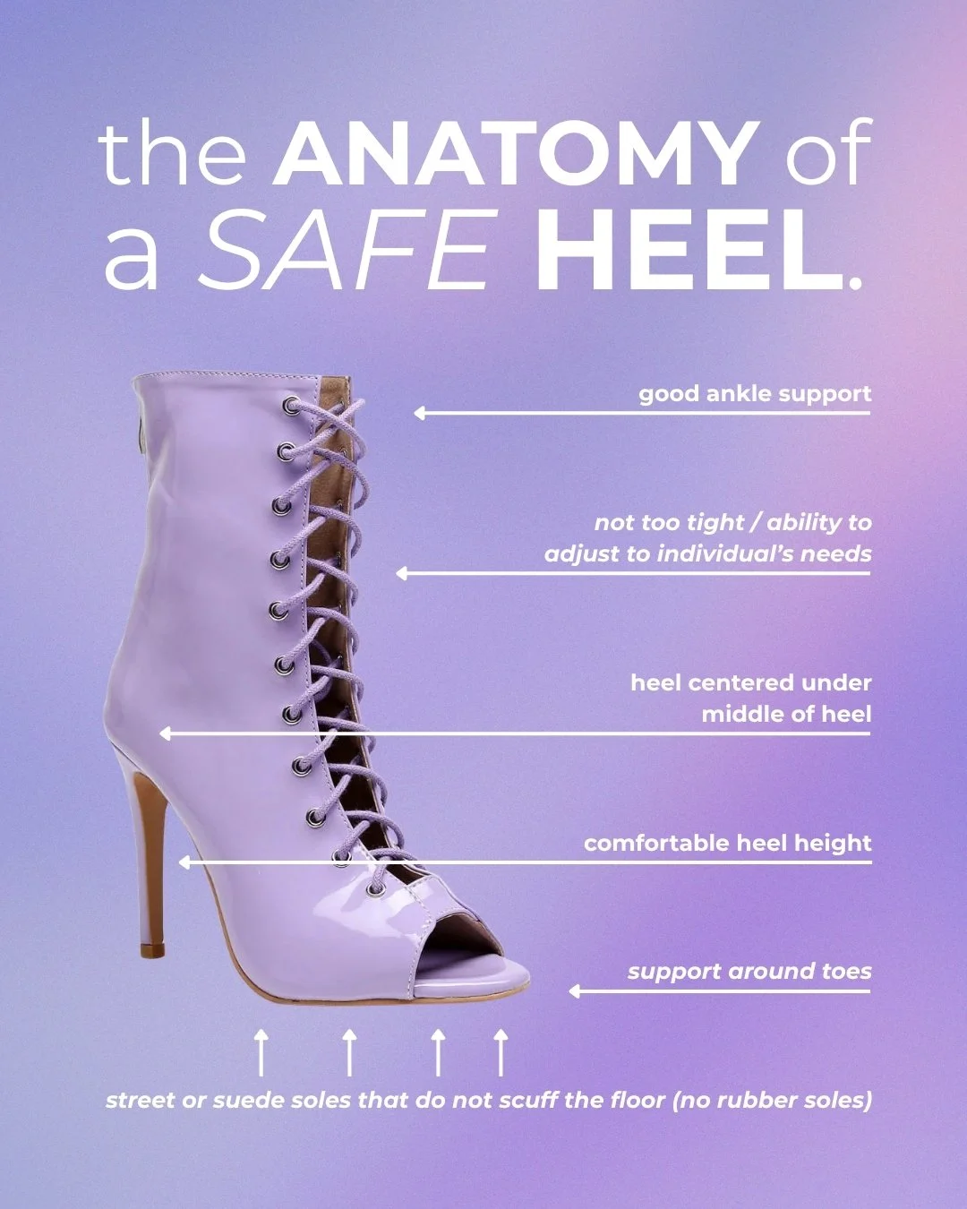 Make sure your heels do not have rubber soles, as they stick to the floor & it is bad for your joints. Street or Suede soles are the best!
